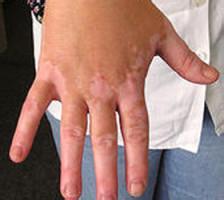 白癜风的症状一:白癜风早期症状不明显,初期的白斑多为指甲或钱币大,近似圆形、椭圆形或无规则形,境界多明显,有的边缘绕以色素带,其白斑处除了色素脱失外,其白斑皮肤表面比较的光滑,没有鳞屑或萎缩的症状,有的患者白斑将会累及到患者的毛发,毛发变白,但也有长久不变的。